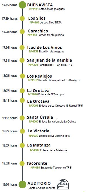 Northern route: Departure from Buenavista at 5:15 p.m., with stops in Los Silos, Garachico, Icod de Los Vinos, San Juan de la Rambla, Los Realejos, La Orotava, Santa Úrsula, La Victoria, La Matanza and Tacoronte.