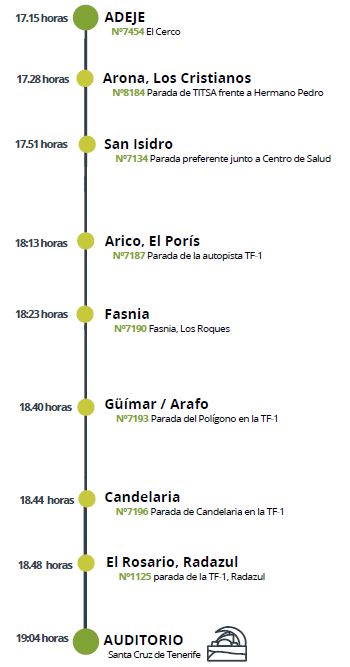 Southern route: Departure from Adeje at 5:15 p.m., with stops in Arona (Los Cristianos), San Isidro, Arico (El Porís), Fasnia, Güímar/Arafo, Candelaria and El Rosario (Radazul).