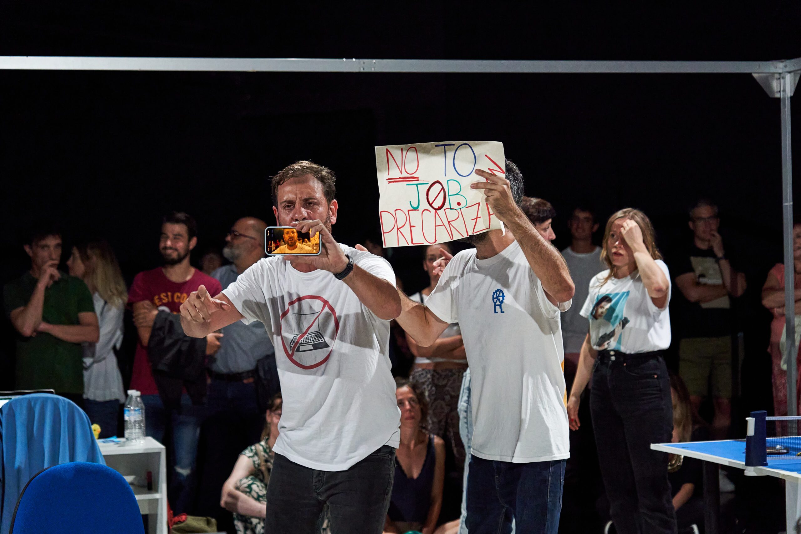 En este espectáculo, un grupo de jóvenes freelancers prestan servicio, a través de sus móviles y computadoras, para una empresa multinacional. En un contexto de gran despersonalización del vínculo laboral, deciden organizar un reclamo. La obra narra entonces las nuevas dinámicas laborales en la era de las sociedades multitasking, en un mundo a la vez conectado y disuelto.