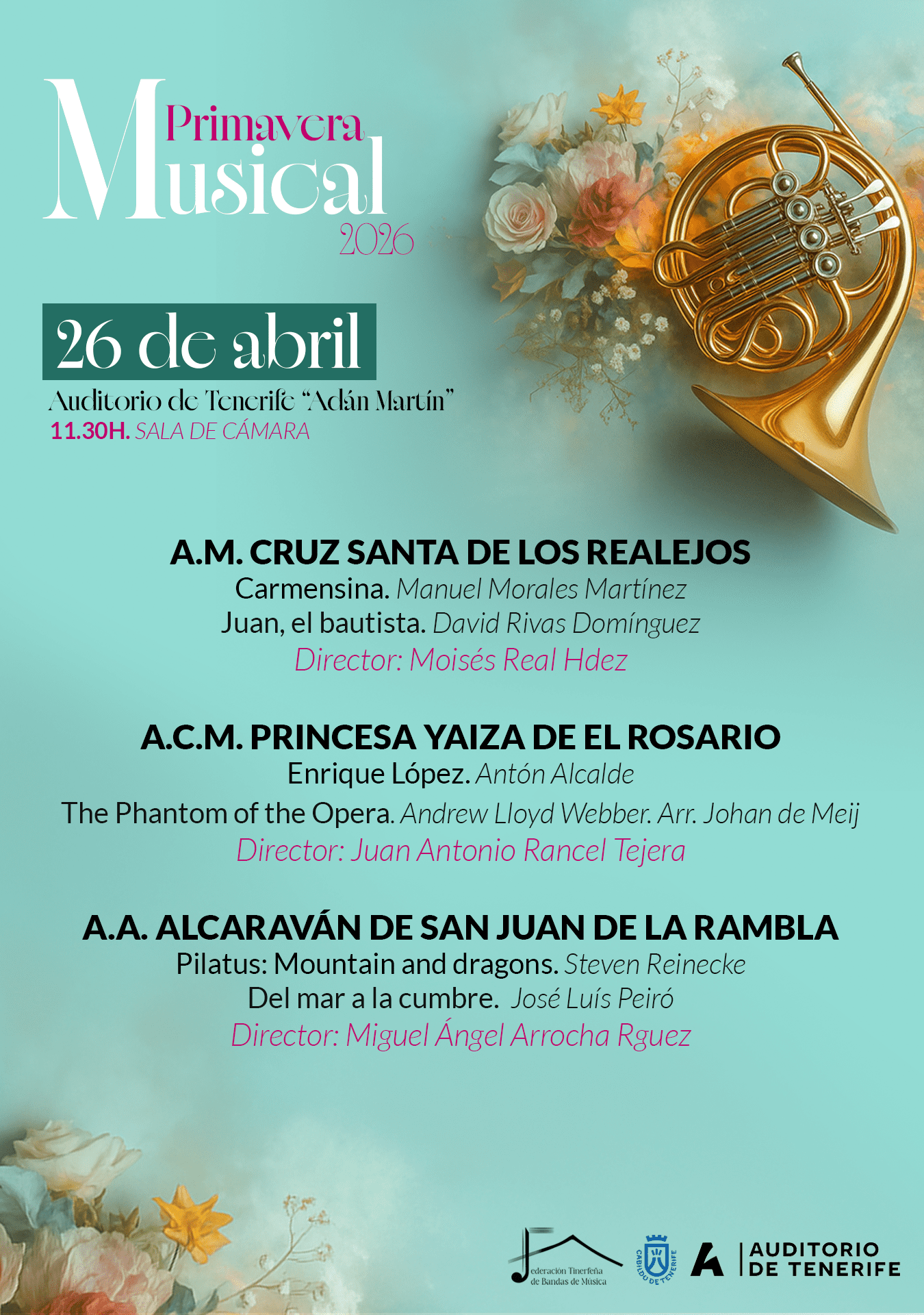 The ‘Primavera Musical’ cycle (Musical Spring Cycle) is organised by the wind bands federation ‘Federación Tinerfeña de Bandas de Música’ with the collaboration of Tenerife Island Council. The event will be held at the Auditorio de Tenerife between March and June.