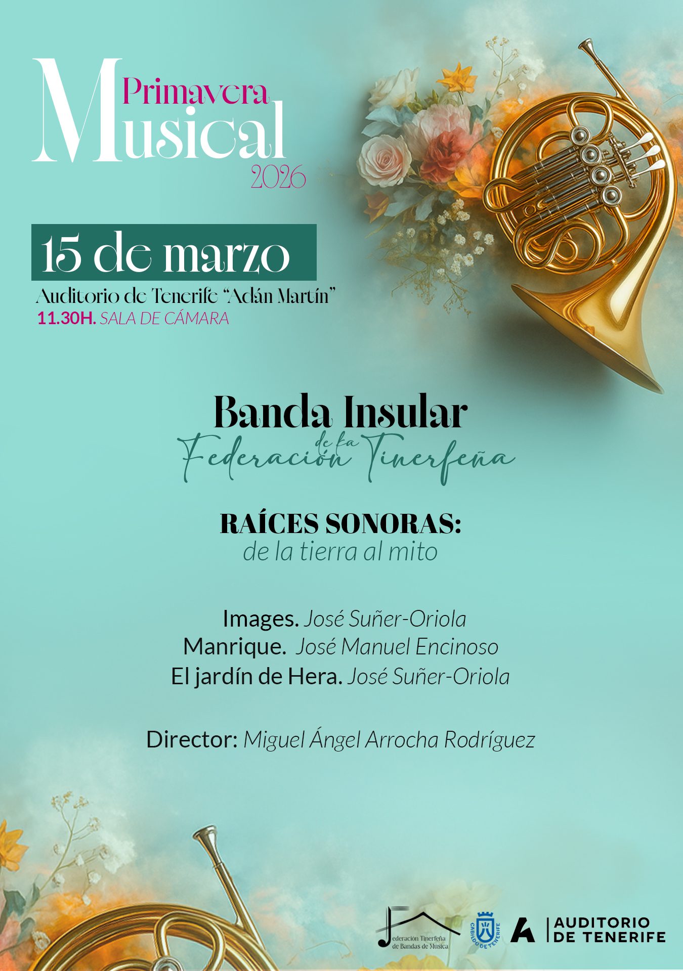 La inauguración de este ciclo de conciertos correrá a cargo de la Banda Insular de la Federación Tinerfeña, bajo la dirección de Miguel Ángel Arrocha Rodríguez, que ofrecerá el programa Raíces sonoras: de la tierra al mito, que incluye obras de Jesús Suñer-Oriola y del compositor tinerfeño José Manuel Encinoso.
