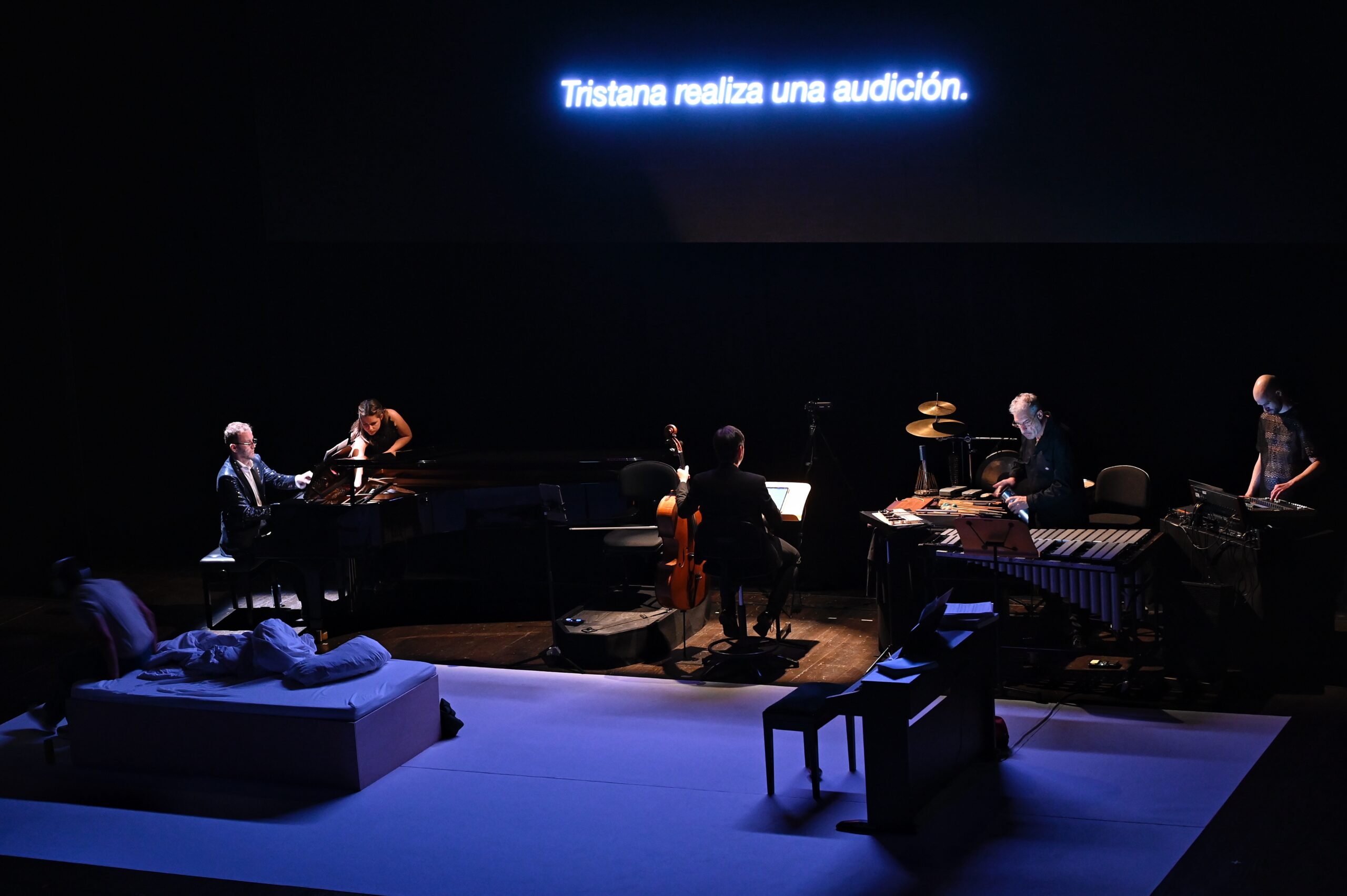 La partitura original, compuesta por Miguel Huertas, es interpretada por un ensamble de piano, violonchelo y percusión, y da voz a un elenco compuesto por una soprano, un tenor, un barítono y una actriz. En escena, los personajes —Juan López Garrido, Tristana, Horacio y Saturna— atraviesan un paisaje íntimo, político y emocional donde se cruzan el amor, el poder, la dependencia y la necesidad de romper con todo.